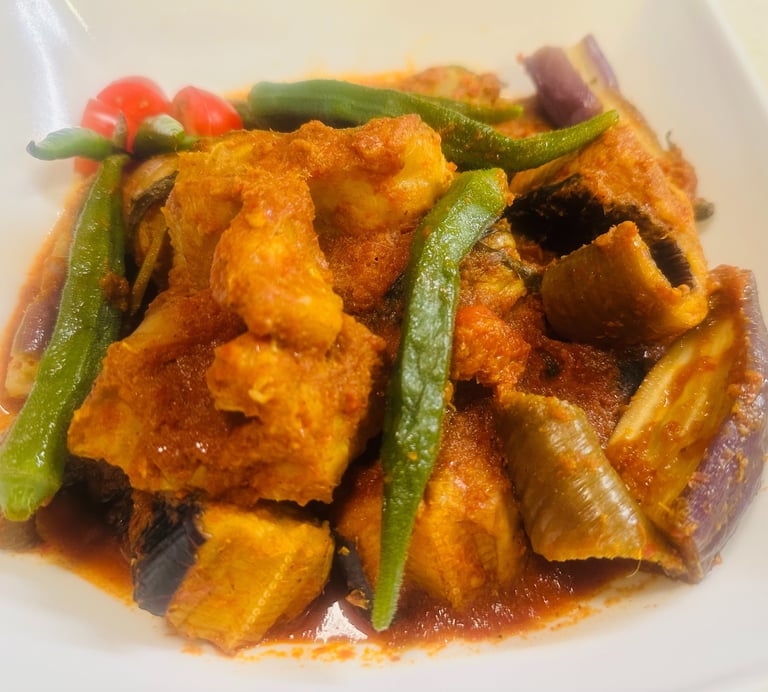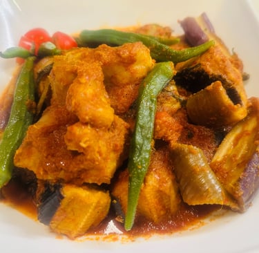 A beloved Malay classic from the heritage kitchens of Malacca, this Asam Pedas combines the perfect balance of sour and spicy. Fresh ray fish is gently simmered in a tamarind-infused gravy with a blend of aromatic spices, eggplant, and ladies fingers. Fragrant daun kesom lends its signature herbal note, creating a dish that is vibrant, tangy, and deeply comforting.